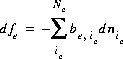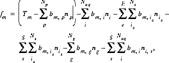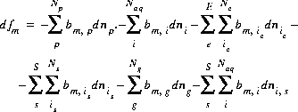 where the value of the function, fm, is zero when mole-balance is achieved. Tm is the total number of moles of the element in the system. E is the number of exchangers in the exchange assemblage, S is the number of surfaces in the surface assemblage. Np is the number of phases in the pure-phase assemblage, Naq is the number of aqueous species, Ne is the number of exchange species for exchanger e, Ns is the number of surface species for surface s, and Ng is the number of gas components. The number of moles of each entity in the system is represented by np for phases in the pure-phase assemblage, ni for aqueous species,