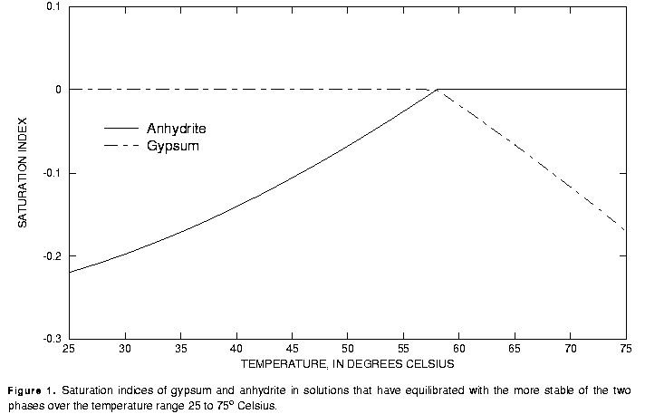 The saturation indices for all of the reaction steps are plotted in figure 1. In each step, pure water was reacted with the phases at a different temperature (the reactions are not cumulative). The default database for PHREEQC indicates that gypsum is the stable phase (saturation index equals 0.0) at temperatures below about 57oC; above this temperature, anhydrite is the stable phase.