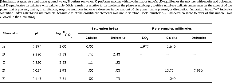 of 10-2.0 atm. (B) Seawater is defined using the major-ion data given in table 2. (C) The two solutions are mixed together in the proportions 30 percent seawater and 70 percent ground water. (D) The mixture is equilibrated with calcite and dolomite. Finally, (E) the mixture is equilibrated with calcite only to simulate slow reaction kinetics of dolomite.