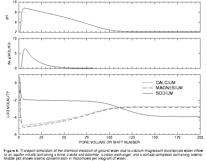 The results of the calculations are plotted on figure 6. During the initial 5 pore volumes, the large concentrations of sodium, calcium, and magnesium decrease such that sodium is the dominant cation and calcium and magnesium concentrations are small. The pH increases to more than 9.0 and arsenic concentrations increase to more than 5 mmol/kg water. Over the next 45 pore volumes the pH gradually decreases and the arsenic concentrations decrease to negligible concentrations. At about 100 pore volumes, the calcium and magnesium become the dominant cations and the pH stabilizes at the pH of the infilling recharge water.